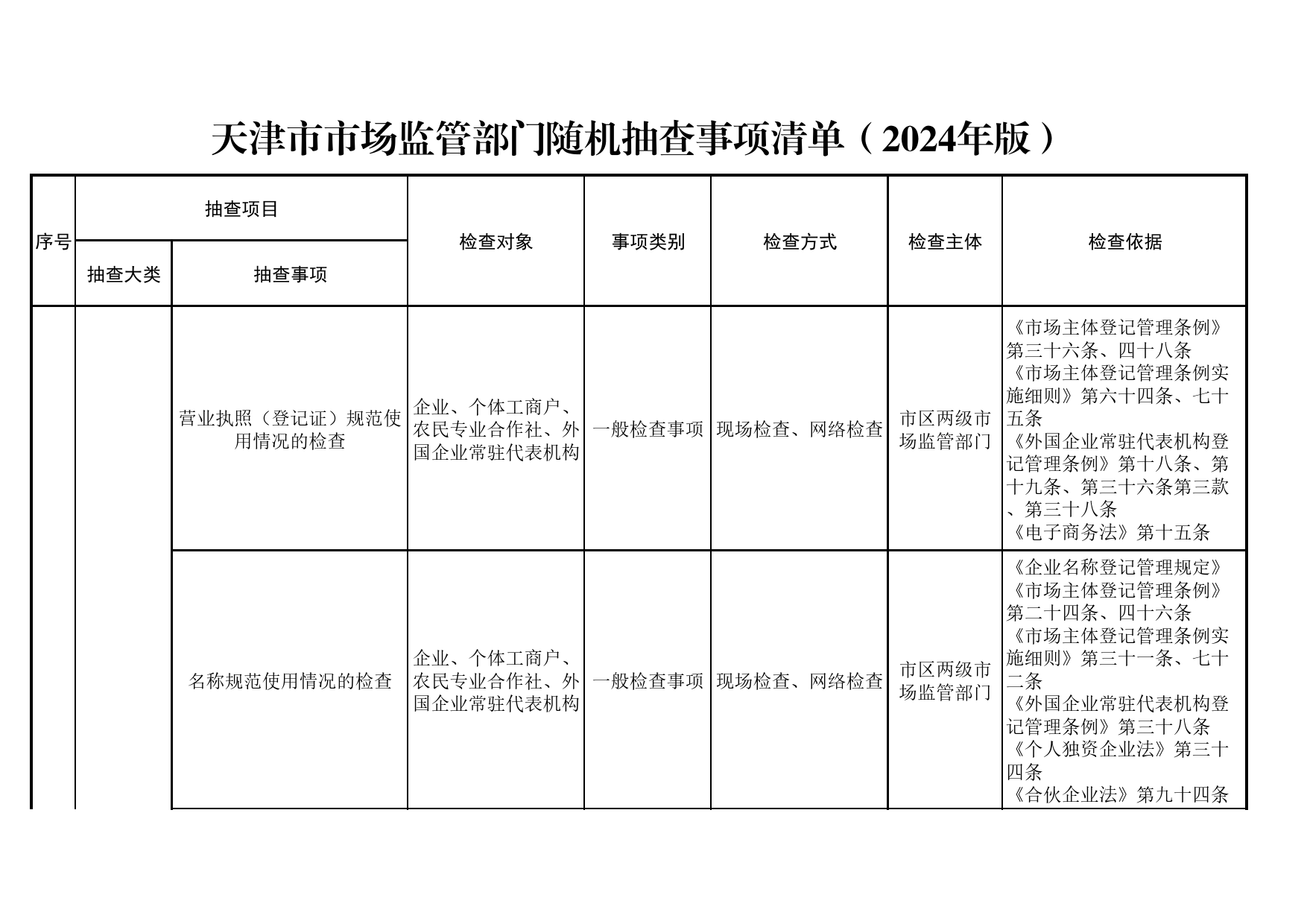 天津市AG真人部门随机抽查事项清单(2024年版)